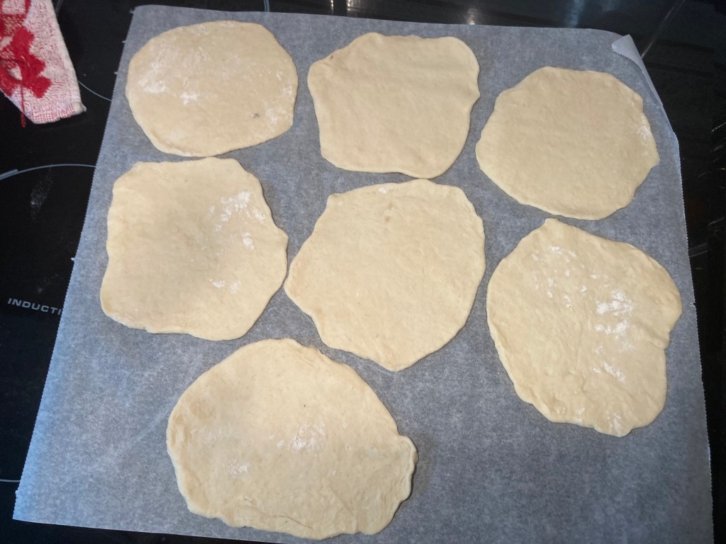 Mientras tanto, cogeremos la masa, que ya habrá doblado su volumen, y haremos bola de unos 50 gramos aproximadamente (nos saldrán unas 15). Enharinaremos nuestra encimera y cogeremos cada bola y, con la ayuda de un rodillo de amasar las aplanaremos, dejándolas lo más estrechas que podamos y dándoles forma más o menor circular.