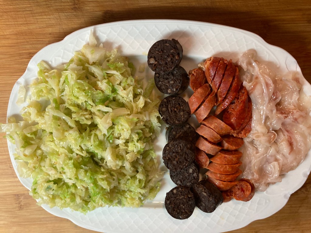 2- En una bandeja suficientemente amplia colocaremos los Sacramentos : la berza salteada, la morcilla y el chorizo y las láminas de Tocino.