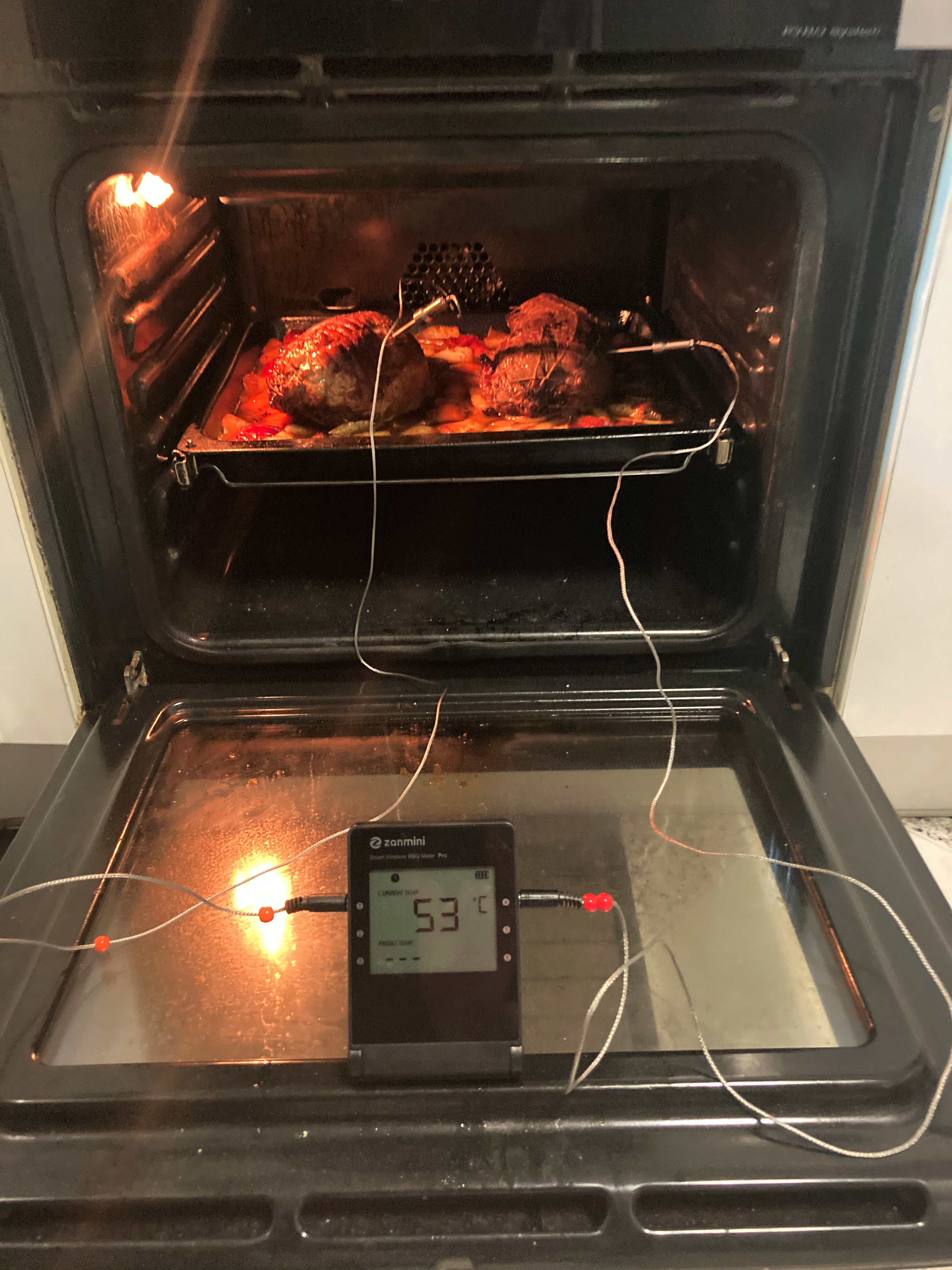La pieza de 1 Kg. tarda aproximadamente una hora en hacerse. En nuestro caso hemos usado una sonda de cocina y, al llegar a los 80 grados hemos retirado el redondo del horno. Estaba bien hecho, pero tierno y jugoso.