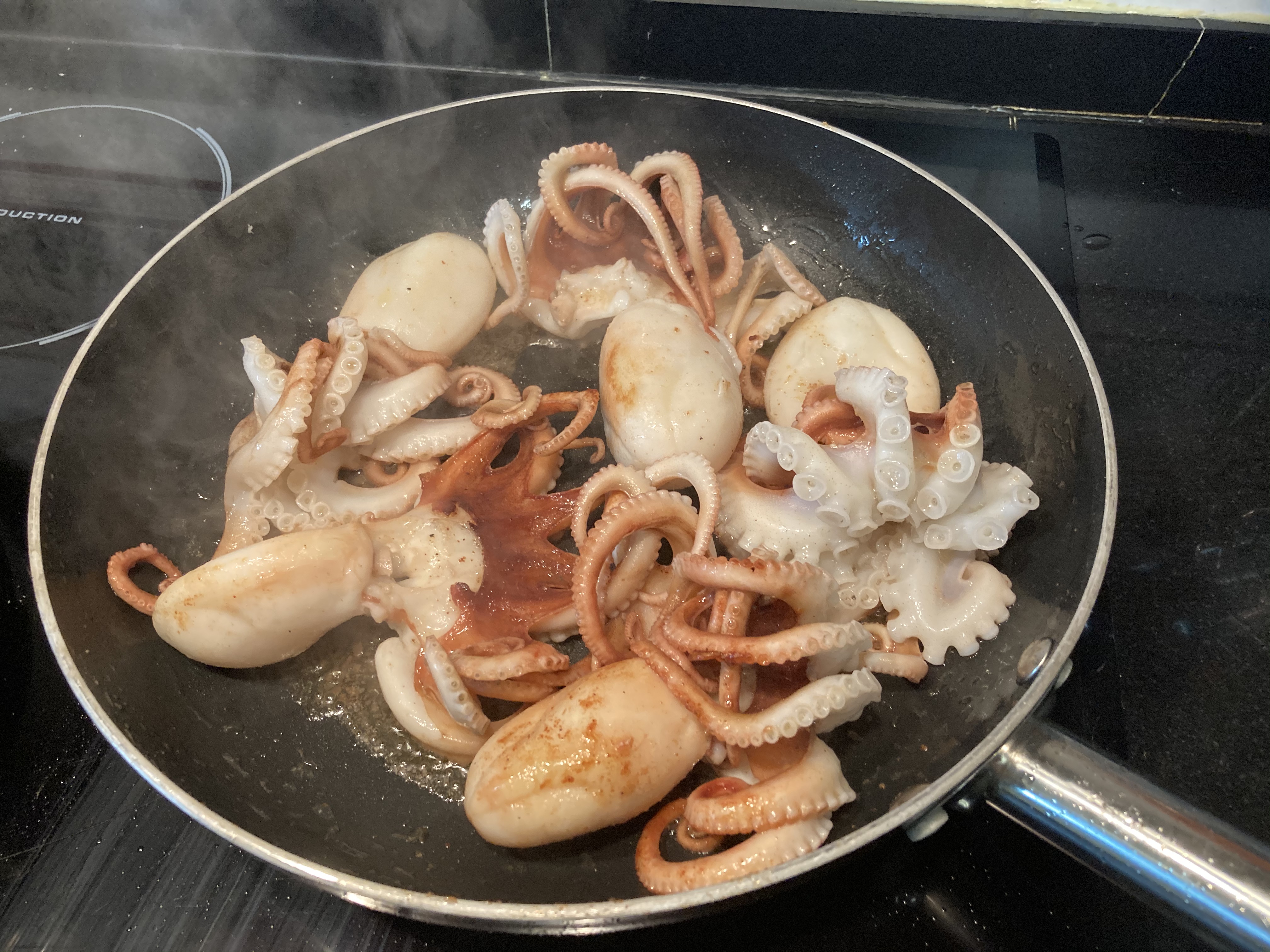 Mientras tanto, limpiaremos los pulpos. En esta ocasión he utilizado pulpos medianos (de unos 150 grs. aprox. cada uno de ellos). Les quitamos las tripas y les retiramos la piel. En una sartén, echamos una cuchara de AOVE y, cuando esté muy caliente echamos los pulpos y salteamos a fuego fuerte. Reservamos aparte.