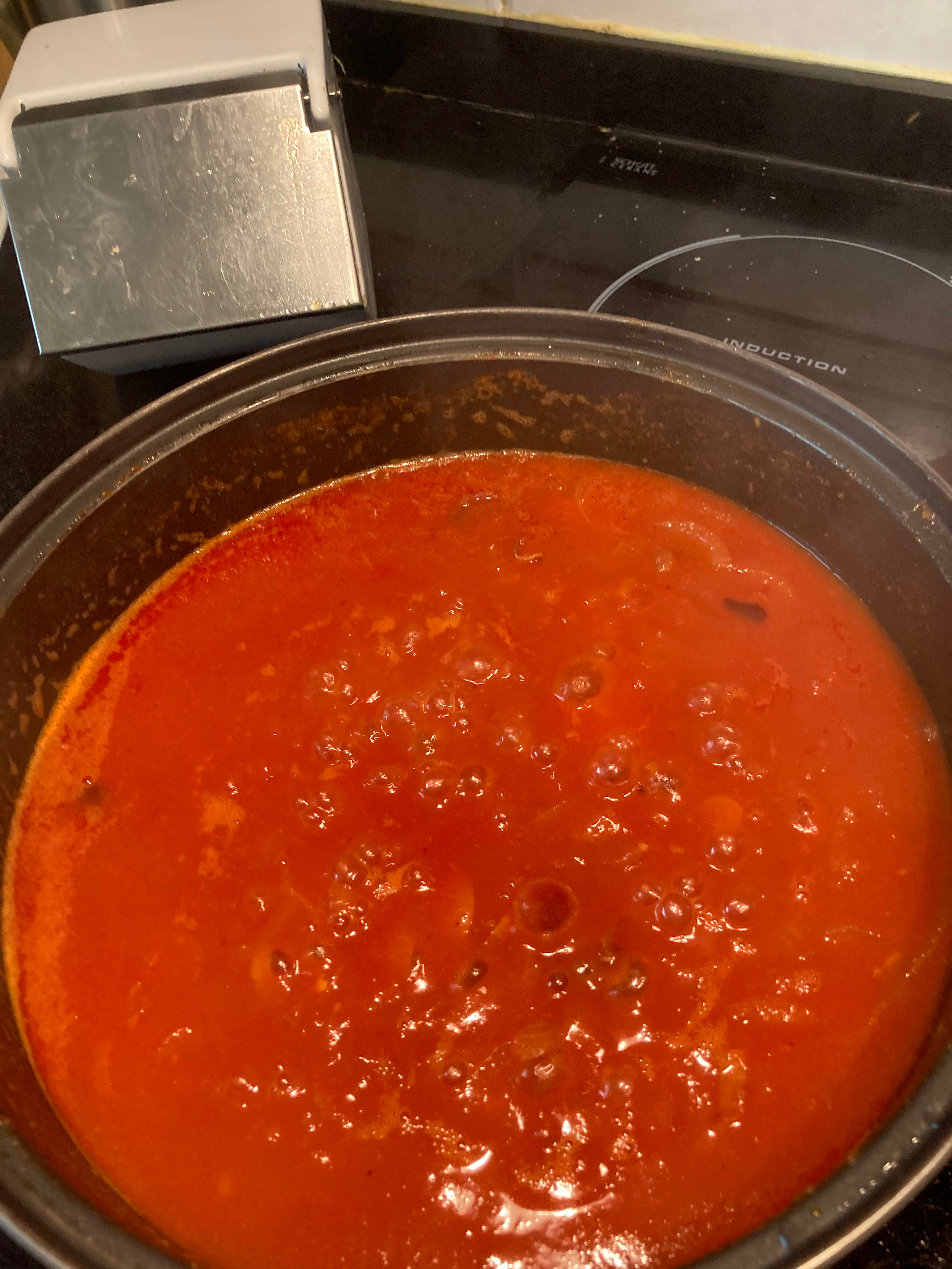 Seguidamente, añadiremos las guindillas y la cucharada de carne de ñora (o de pimiento choricero), removeremos bién y añadiremos el vaso de tomate triturado. Cocinaremos durante unos 8 a 10 minutos y, seguidamente añadiremos el vino blanco, dejaremos que se evapore el alcohol a fuego fuerte, añadiremos el agua (o el caldo) y, cuando empiece a hervir bajaremos el fuego, dejando cocer lentamente.