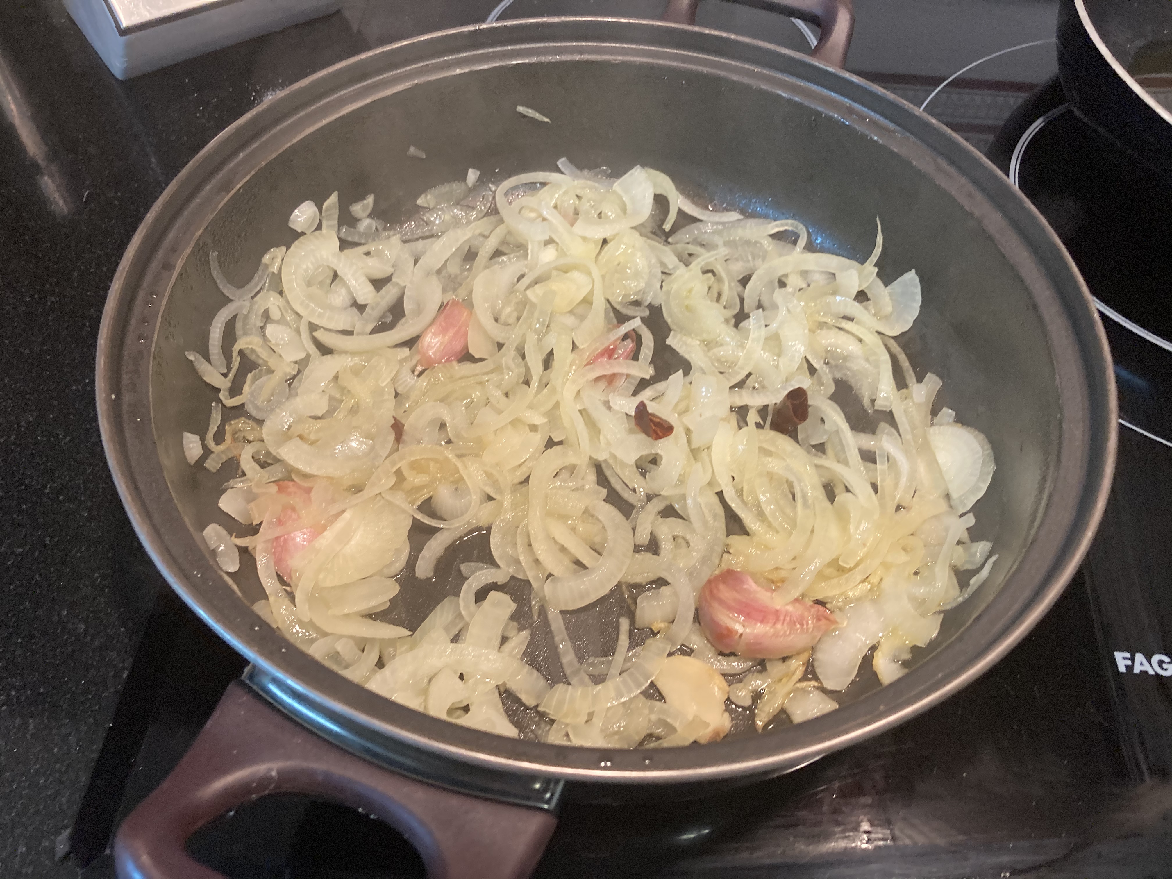 Para empezar a prepara el plato, chafaremos los tres dientes de ajo y los echaremos a una cazuela ancha y baja con un par de cucharadas soperas de AOVE. Cuando esté hecho, añadiremos las cebollas cortadas en juliana. Pocharemos todo junto a fuego suave hasta que la cebolla esté blanda y transparente.