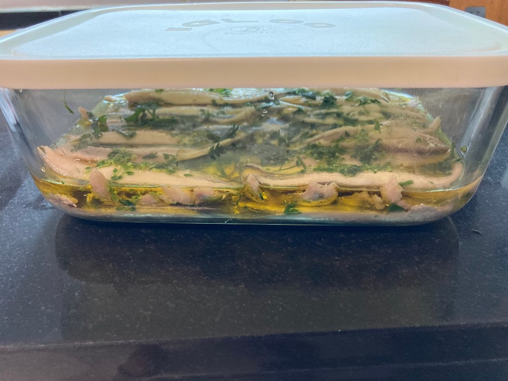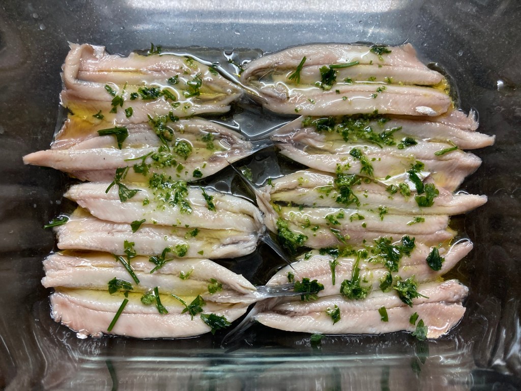 Transcurrido ese tiempo, escurriremos los boquerones y los pasaremos a una bandeja donde los colocaremos con la piel hacia abajo y les echaremos el ajo y el perejil finamente picados y un generoso chorro de aceite de oliva virgen extra, en sucesivas capas.