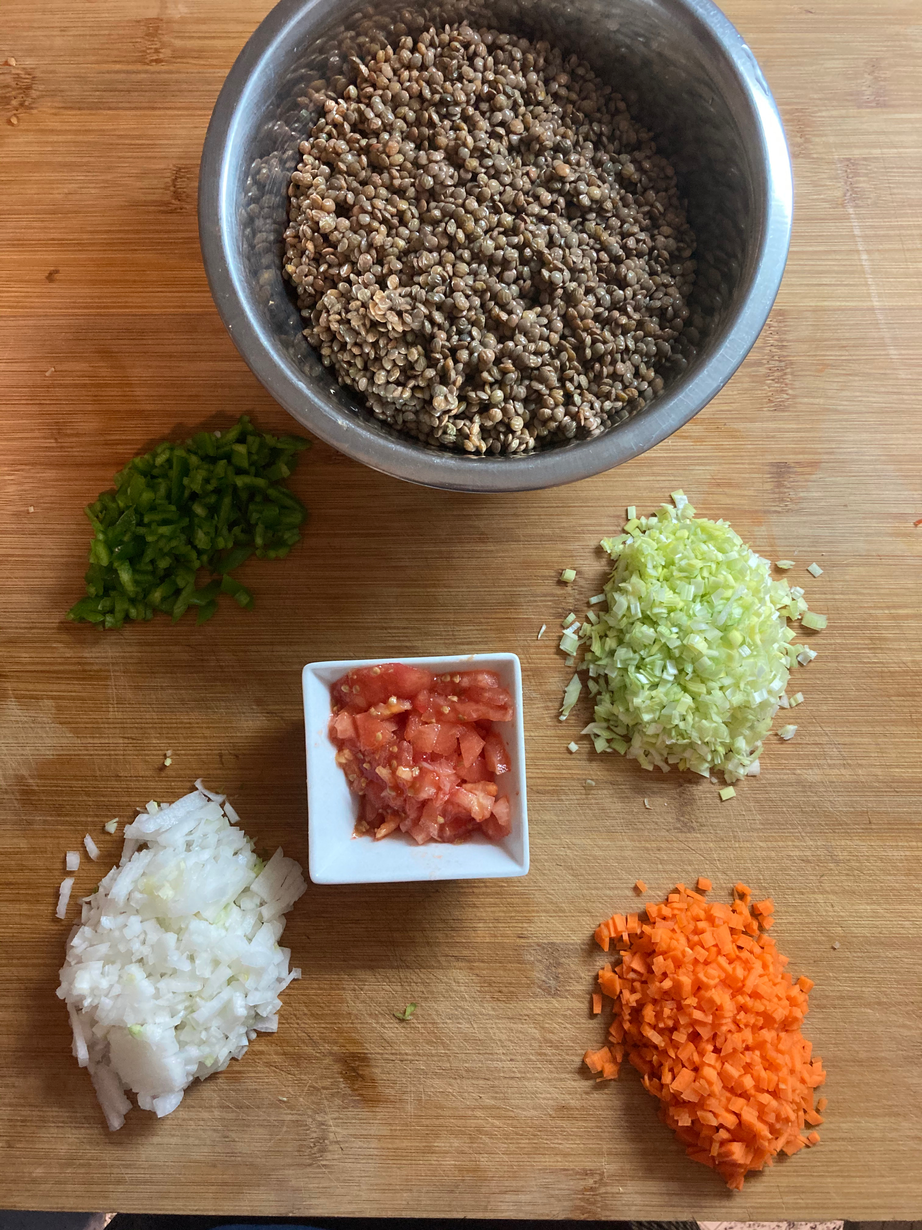 Lo primero que haremos será lavar bien las lentejas bajo el chorro de agua del grifo y, a continuación, picaremos bien finas las verduras (cebolla, puerro, la zanahoria, el pimiento verde y el diente de ajo).