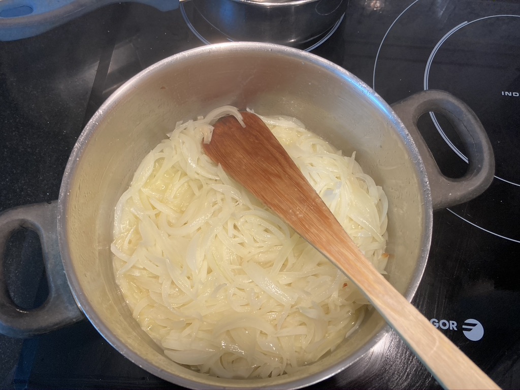 Para empezar, cortaremos toda la cebolla en juliana fina, reservaremos, y, en una cazuela suficientemente grande, pondremos el aceite de oliva y la mantequilla. Cuando ésta esté fundida y mezclada con el aceite, añadiremos la cebolla, echaremos un poquito de pimienta negra recién molida y salaremos (la sal nos ayudará a sudar las cebollas y a que éstas se ablanden antes). Dejaremos pochar a fuego lento, removiendo frecuentemente con una cuchara de madera hasta que la cebolla quede transparente, pues no queremos que nos tome mucho color. Este proceso nos llevará, dependiendo de la cebolla, de 20 a 30 minutos.