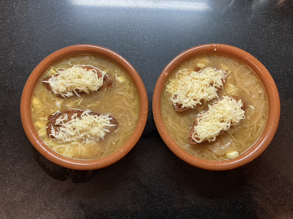 En unos recipientes individuales aptos para ir al horno (y si no tenemos, en uno grande), echaremos la sopa, colocaremos, con cuidado, en el centro del plato las rebanadas de pan tostado y cubriremos con el queso emmental rallado.