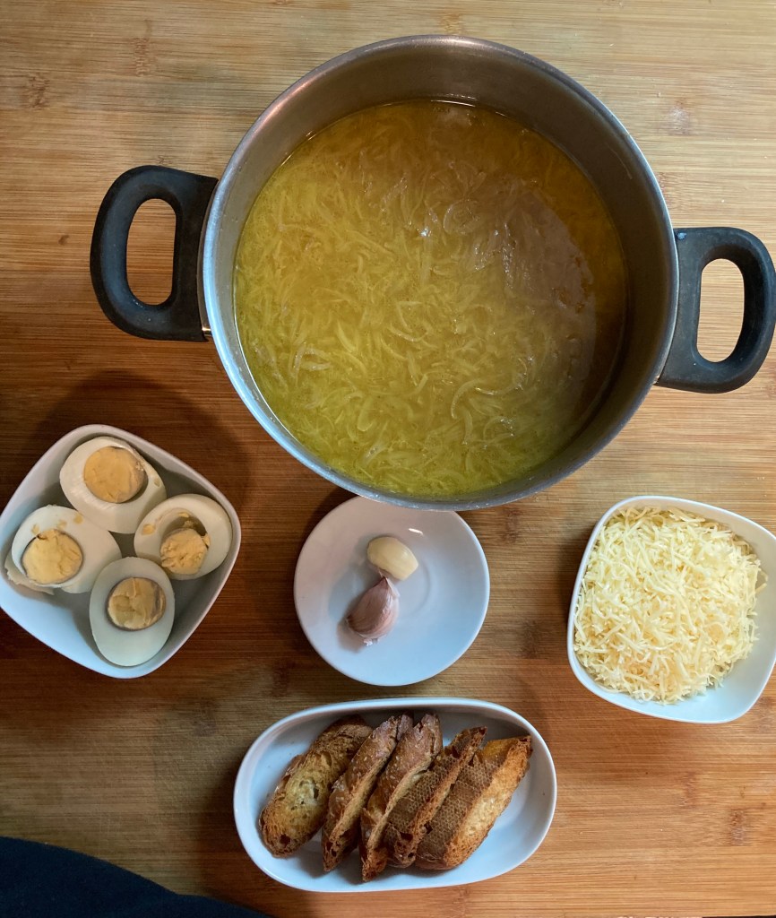 La sopa de cebolla es un plato de origen francés; una de sus sopas más reconocidas que hemos incorporado perfectamente a nuestro recetario. Nosotros hemos hecho esta sopa en casa a menudo; tan pronto aparecía el frío y necesitabas templar el cuerpo, era una de nuestras primeras opciones gastronómicas. Digamos que nuestra receta es académica con una pequeña excepción: nos gusta añadir un par de huevos duros. No es imprescindible, pero podéis probarlo, queda estupendo.