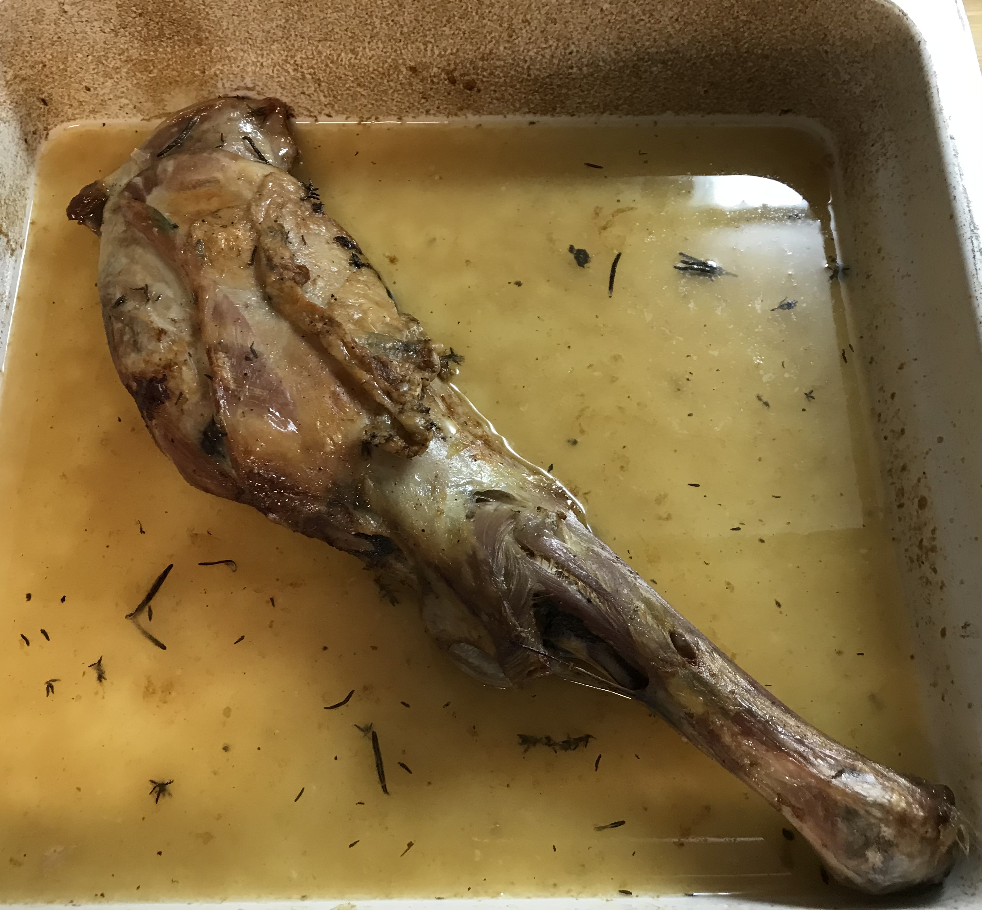 De nuevo volteamos la pieza de lechal y añadimos por encima un vaso de caldo de carne, 1/2 vaso de vino blanco y 1/2 vasito de vinagre, dejando asar durante otros 30 minutos más.