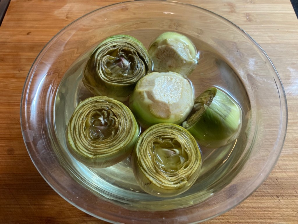Seguiremos con las alcachofas: Cortaremos los tallos y daremos forma a la base, quitaremos todas las hojas exteriores, y cortaremos, aproximadamente por la mitad, dejando únicamente los corazones de las alcachofas.