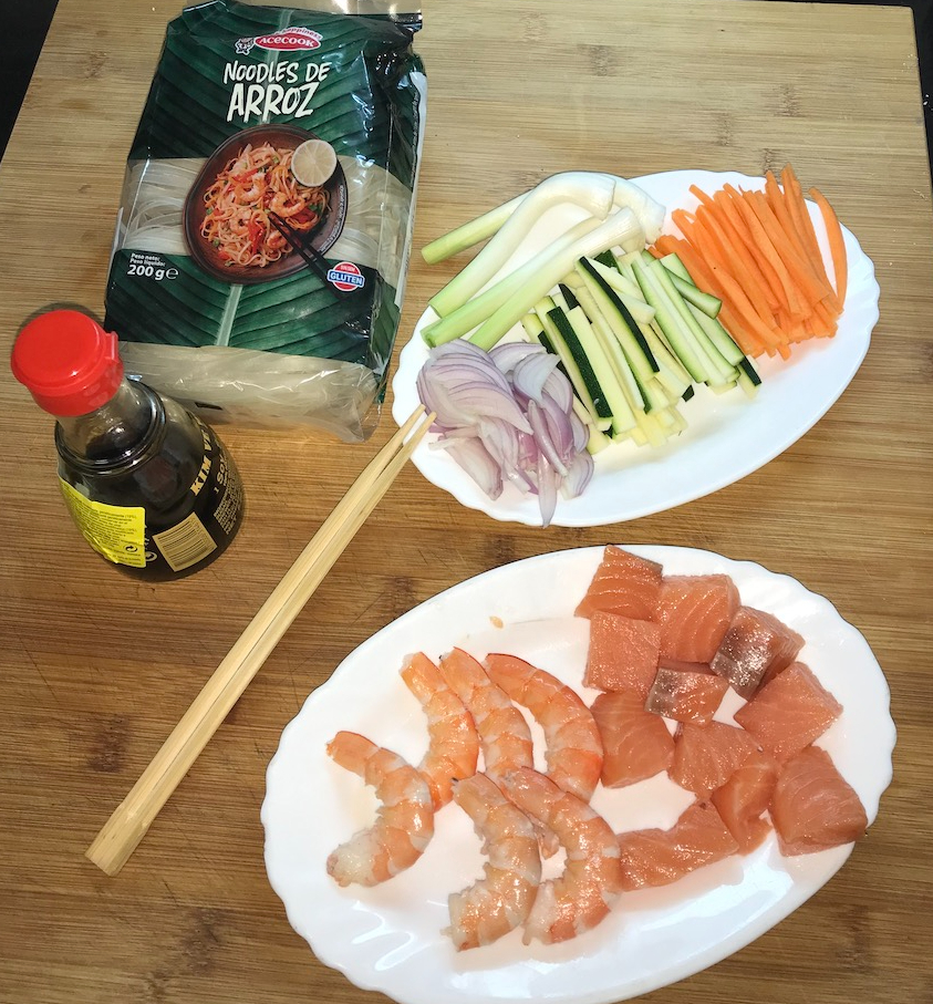 En esta ocasión vamos a utilizar salmón y langostinos y unos magníficos Noodles de arroz que se pueden encontrar en cualquier tienda o supermercado.