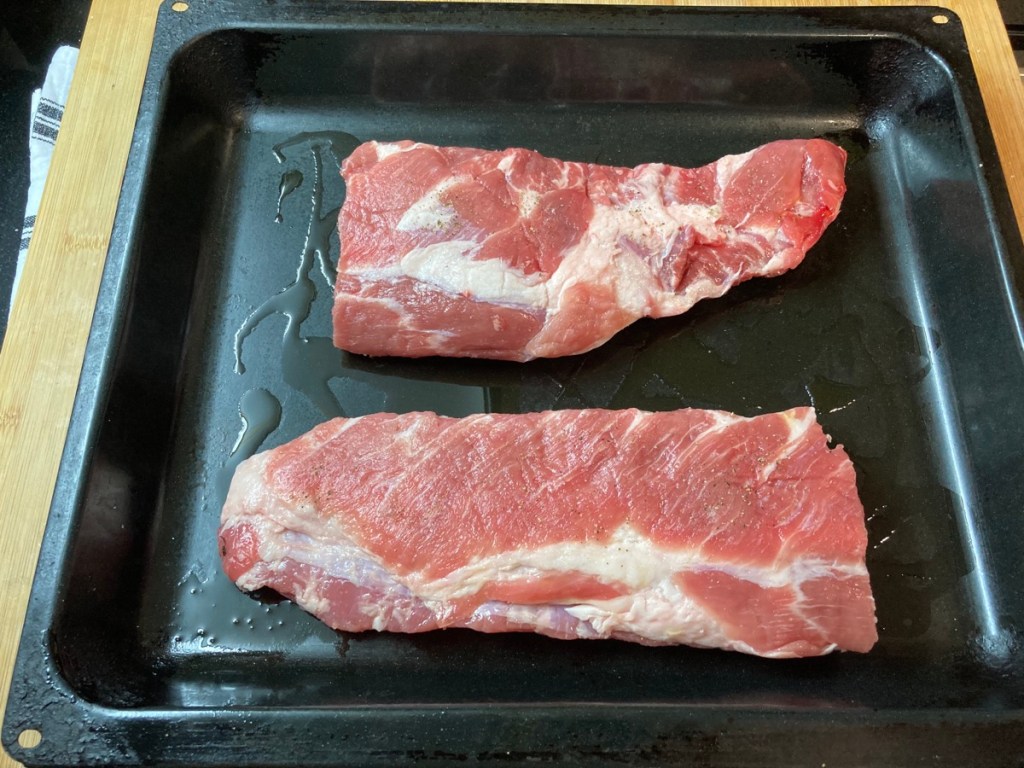 Salpimentamos el costillar por ambos lados y lo colocamos en la bandeja del horno, que habremos pincelado ligeramente de AOVE. Introducimos la bandeja en el horno, a media altura.