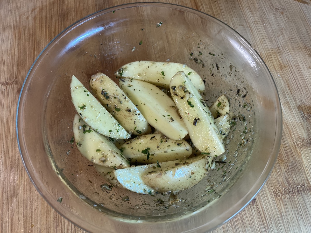 En un bol suficientemente grande para que quepan las patatas, mezclaremos las hierbas y especies elegidas. En ese caso hemos utilizado romero, tomillo, orégano, pimienta negra recién molida, ajo en polvo y pimentón rojo al 50% (mitad y mitad dulce y picante). La cantidad depende de cada uno, en el caso de hoy, hemos utilizado aproximadamente una cucharadita de café de cada, pero, insisto, podéis usar otras especias y variar la cantidad. Seguidamente añadiremos un par de cucharadas soperas de AOVE y mezclaremos bien. Reservamos.