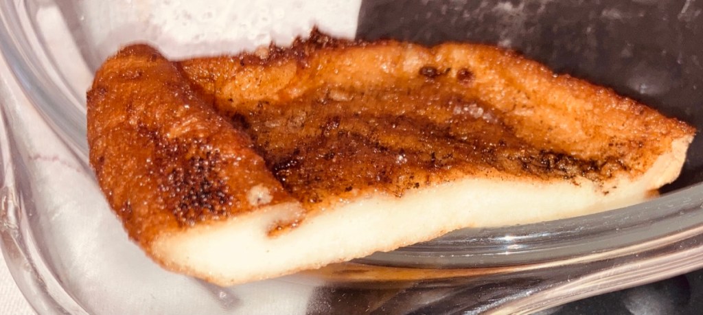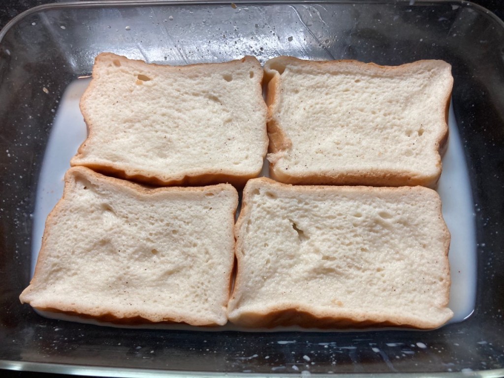 Si utilizamos una barra de pan duro, con un cuchillo de sierra cortaremos rebanadas de 1,5/2 cms de grosor. Si usamos pan para torrijas, estas rebanadas nos vienen ya cortadas. Las introduciremos en la bandeja con la leche infusionada, dándole una vuelta para que se impregnen por todos lados. Este proceso debe ser rápido (máximo un par de minutos) para que no se nos impregnen en exceso las rebanadas de pan y se nos rompan.