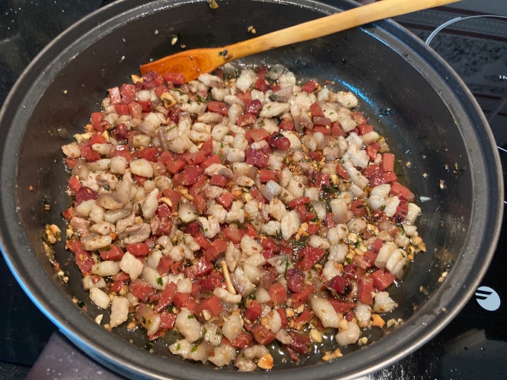 Seguidamente, añadiremos la panceta y el jamón cortados a daditos pequeños y saltearemos a fuego medio/bajo, dejando que se desgrasen durante 7 a 10 minutos.
