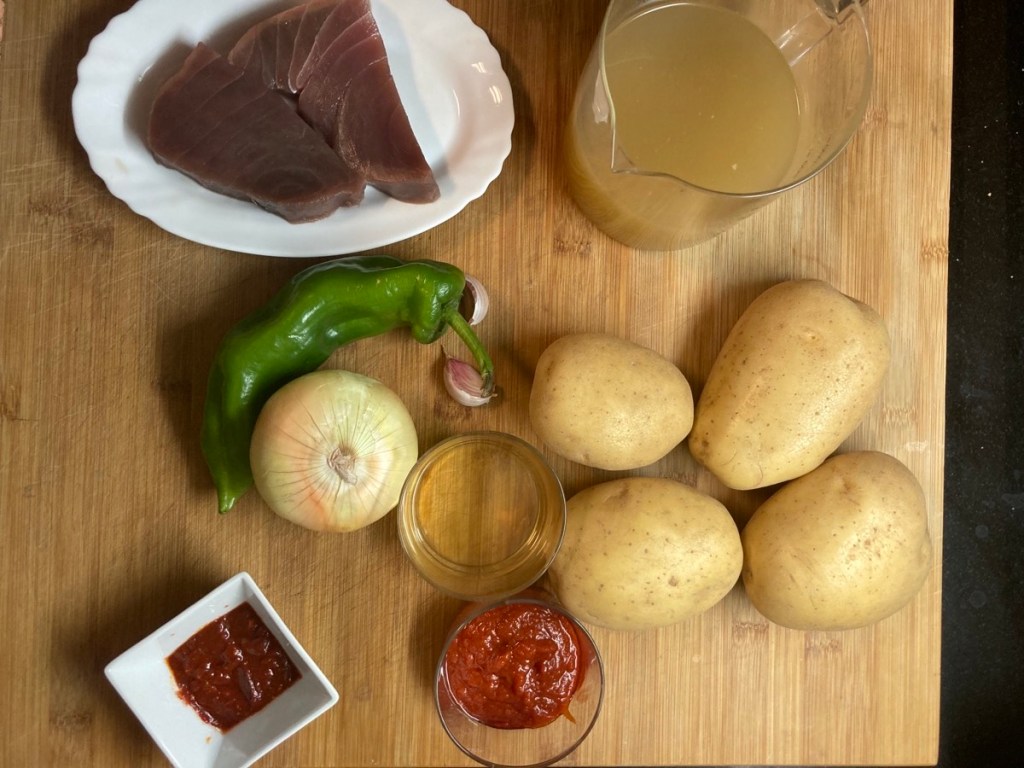 - 800 gramos de atún fresco o bonito; sin piel ni espinas y cortado a dados