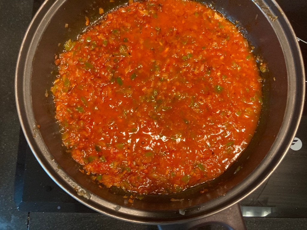 A continuación, se pica la cebolla y el pimiento verde bién finitos y se dejan pochar en una cazuela lentamente con una cucharada de un buén aceite de oliva; salamos y, cuando está casi hecho, le añadiremos el diente de ajo picado finamente y dejaremos cocer un rato más, hasta que el ajo esté hecho.