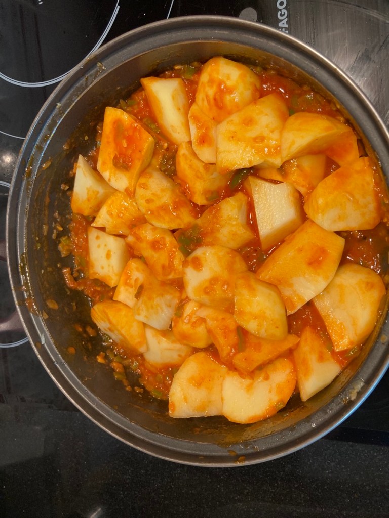 Cuando observemos que el sofrito ya está bien ponchado, escurriremos las patatas y las añadiremos, rehogándolas a fuego vivo durante 3 o 4 minutos.