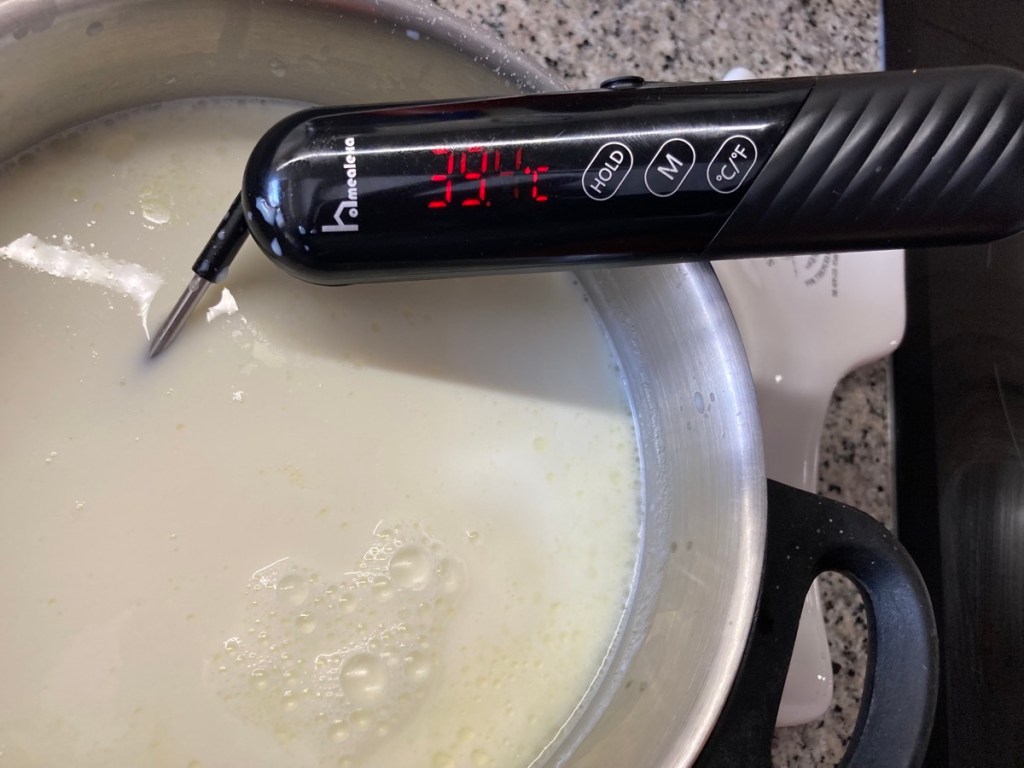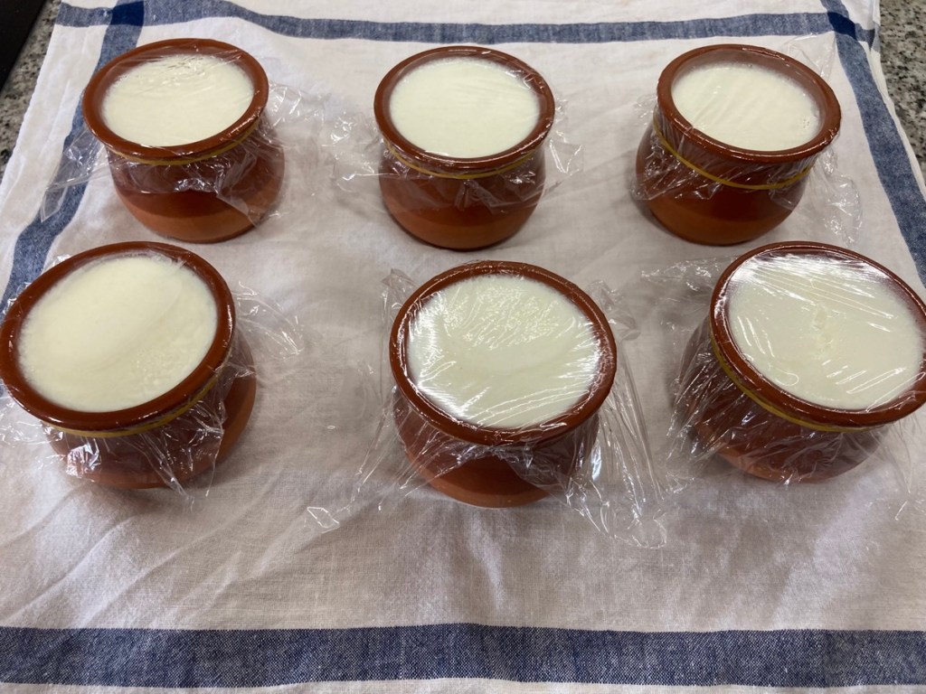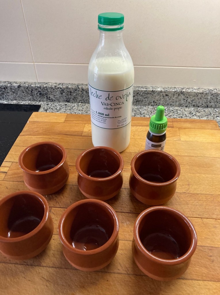 La elaboración de esta cuajada es muy sencilla y tan solo necesitaremos un termómetro de cocina, una cazuela para calentar la leche y seis vasos con una capacidad de 160 gr. (yo he usado los típicos de barro)